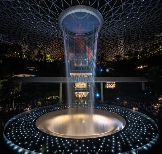 新加坡樟宜机场内的人工瀑布,转机时间长的可以出关去看看,还是很美很壮观,我的三脚架打包了所以机位很勉强,如果有一个徕图大力夹会有用很多。 最后的表演高光时刻,星耀樟宜。