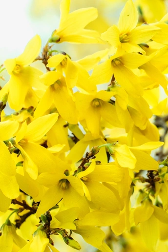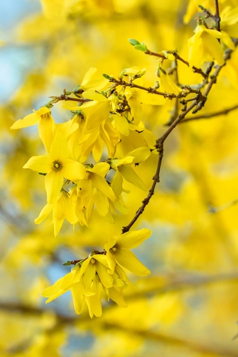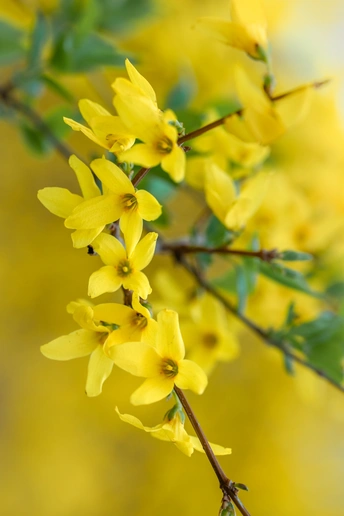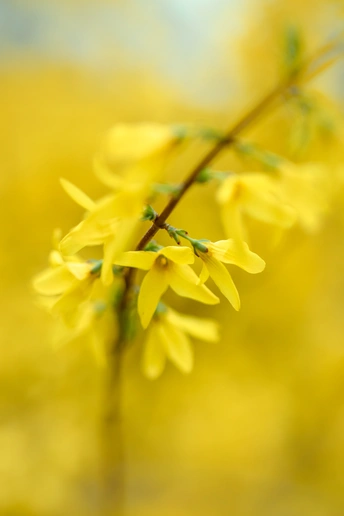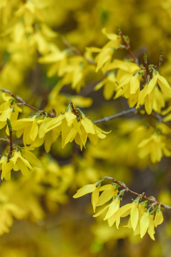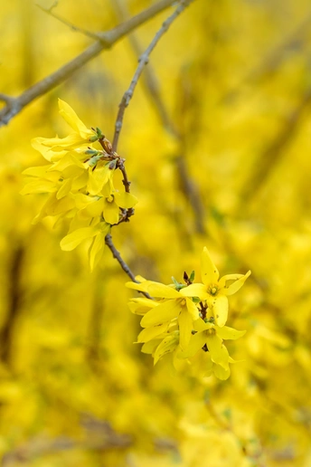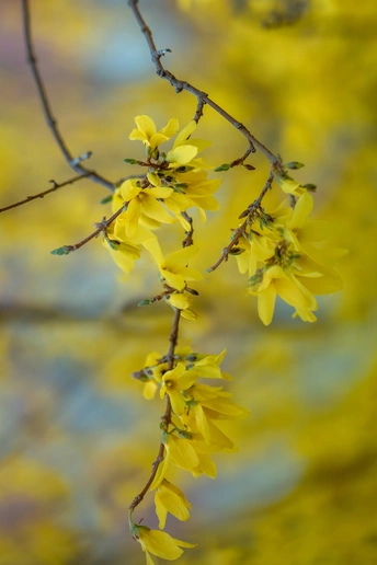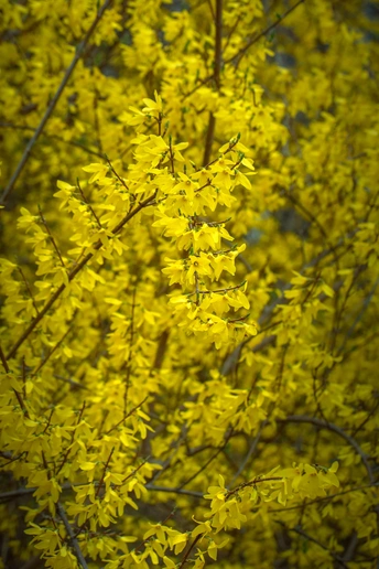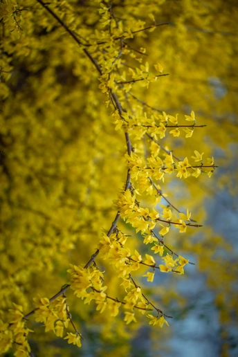 连翘的花朵并不大,但满枝金黄,花色点点,带有几分娇艳,一簇簇,一丛丛,高的矮的,肥的瘦的,都齐心协力,尽情绚烂得一塌糊涂,彰显着生命的活力。那份正黄色格外醒目,怡然自得地绽放,在这人间四月天,尽情渲染,形成强烈的视觉对比,令人精神一振。它是一味常用的中药材,有清热解毒、增强人体免疫的功效。它那黄澄澄、金灿灿的花朵缀满纤细柔韧的枝条,描绘出一幅春意盎然的图画。