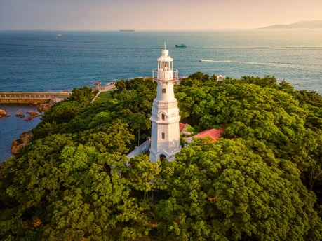 图片拍摄于下午落日时分的小青岛公园 白色的灯塔和绿色的树木、红色的瓦片以及远处的海面与天空构成一副唯美的画面! 四十年代初东面筑起初具规模的“防波堤”与陆地相接,后有人视其形如琴,又名琴岛。1898年,德国租占胶州后,在岛上建起灯塔。解放后,该岛一直为中国海军快艇支队沿用,并对灯塔进行了大规模修建,现塔高15.5米,塔身白色,呈八角形,是国内外船只进出胶州湾的重要标志。每当夜幕降临以后,塔上的红灯与栈桥上的灯光在碧波上浮动,构成了一幅美妙图画,故“琴屿飘灯”被誉为青岛十大景观之一,被作为青岛市的标志之一。 1988年,小青岛开辟为公园,并正式对外开放,全岛以栽植黑松为主的基础上,还栽有樱花、碧桃、石榴、木槿、紫薇等春、夏、秋三季开花的观赏植物,在岛上地势较为平坦的南部有一个非常小巧的广场,广场中间立有手抱古琴、目视海面的“琴女”雕塑。