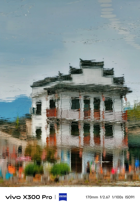 一汪碧水作镜,把桐庐深奥的徽派黛瓦白墙揉进涟漪里。马头墙的棱角在波纹中晕成柔软的线,白壁的素净与木窗的赭红,随水纹漾开成流动的色块——是江南特有的朦胧,也是时光在水面写下的诗。 水下的世界,是岸上古村的另一种形态:屋宇倾斜、檐角轻颤,往来行人的衣袂与岸边草木的绿意,都化作模糊的光斑,裹着徽派建筑的风骨,在波心轻轻摇晃。没有刻意的构图,只有自然的褶皱:涟漪是笔,把深奥的静,晕成了流动的梦。 这不是简单的倒影,是江南把古村的魂魄,浸在了水里。