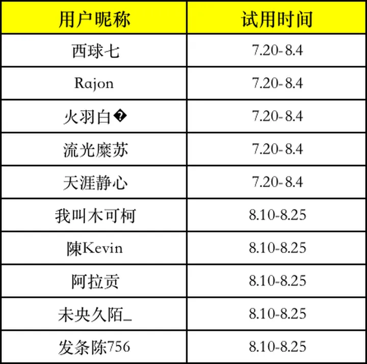 试用时间:7月20日-8月5日/8月10日-8月25日
