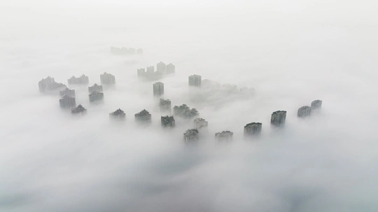 2023年11月26日-四川省资阳市城东新区郊外,晨雾弥漫山丘之间,一列从重庆驶往成都方向的列车从高铁大桥上疾驰而过,被定格的瞬间美如水墨画。