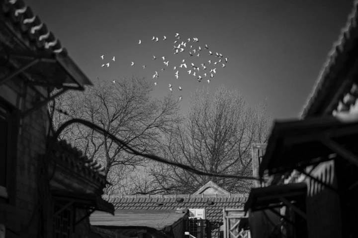 话说地铁就是方便,一下儿扎到烟袋后巷,"呜呜呜"一群鸽子呜央呜央的飞出来,胡同常见的,溜鸽子