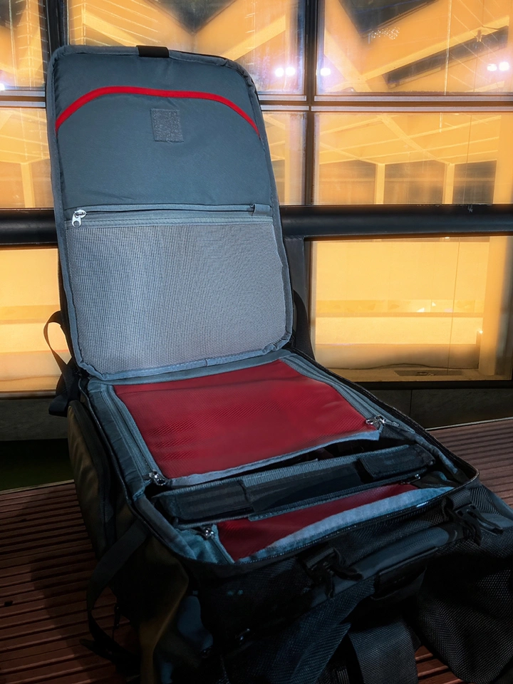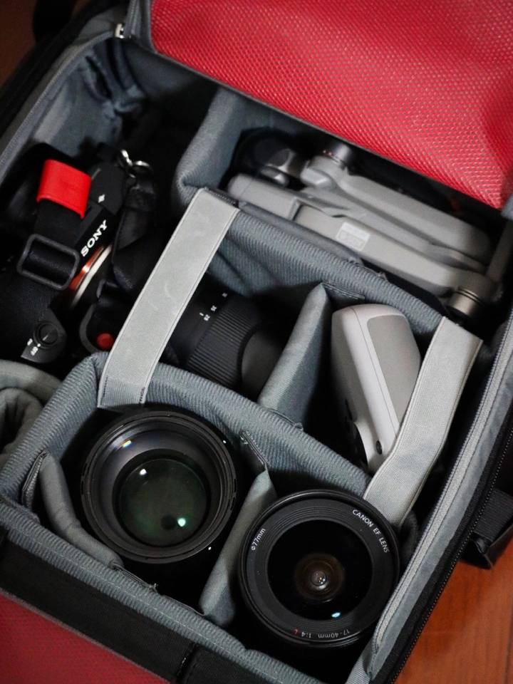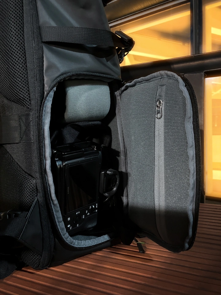 个人习惯一机二镜一无人机的配置,绰绰有余。背包几个口袋可以用来存放相机配件、手机、钱包等小物品。侧边开口方便使用者随时取放相机,大大提高了使用效率。最关键的是它的卷头设计,可以随时扩容,这很重要,可以极大扩展使用场景。