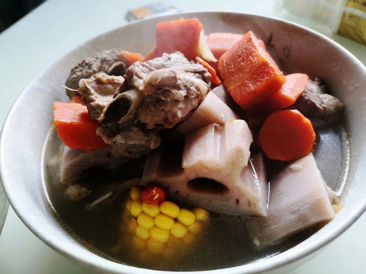 此时,主角之一的玉米登场了,金黄色的外衣下藏着颗颗饱满的甜蜜,切段后与排骨一同下锅,仿佛是大自然最和谐的搭配。清水缓缓注入锅中,火候调至中小,让时间成为最好的调味师。当然你也可以吧玉米换成其他食材,莲藕也是不错的选择哦。