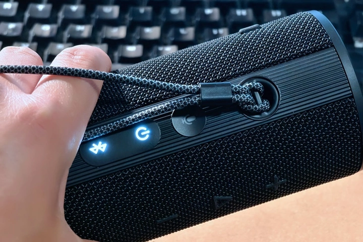 音箱侧面设计有挂绳口,以及麦克风键、电源键、蓝牙键、互联键和TypeC充电口,在旁边还设计有播放/暂停键和音量+-键,操控十分方便。在这里主要说一下这颗蓝牙键,当我们与一台设备连接好之后,再次短按蓝牙键,可以与第二台设备进行连接,也就是说这款音箱支持双设备连接,我日常使用时是同时连接手机和笔记本电脑,播放音乐和接打电话无缝衔接,相当好用。