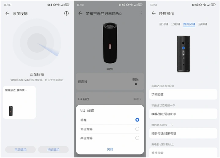 当你使用荣耀手机或是下载荣耀智慧空间APP后,音箱开机靠近手机即可触发弹窗,让我们可以更快速的连接音箱。通过APP还能设置EQ音效、查看快捷操作、进行固件升级等操作,解锁更多功能。