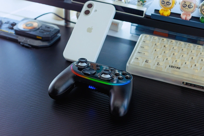 拉开卡扣的同时,手柄就会自动开机,此时摇杆处的1600万色RGB幻彩光环也会同时亮起红色,当与手机连接成功后,则会呈现幻彩光效,并且支持5种灯效模式切换,大大增加了游戏的仪式感。