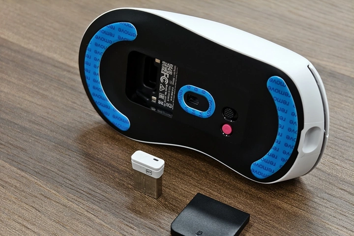 鼠标底部拥有3块特氟龙脚贴,可以减少滑动时的摩擦力,让滑动更加顺畅,能够有效防止鼠标磨损。中间为电源开关以及一颗玫红色DIY独立键,下方则是接收器收纳仓(兼顾磁吸无线充电卡槽+触点),外出携带不易丢失,搭配雷柏无线充电模块,还可以开启鼠标的无线充电功能。