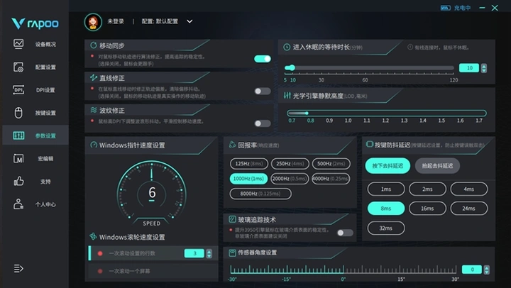 驱动程序中的“参数设置”比较有特色,移动同步(更跟手)正常自动开启,支线修正(移动修正)适合RTS游戏和工作,波纹修正(移动修正)适合不太平滑的桌面;光学引擎静默高度对应输入手感,操作敏感型用户可以微调一下;传感器角度设置对于喜欢抬鼠标的玩家比较有用;“玻璃追踪技术”比较有新意,出差时经常会遇到玻璃桌面,开启后能提升一些稳定性;回报率和按键防抖延迟这两项会提升CPU占用率,如果你电脑配置较低就尽量不要改动了。