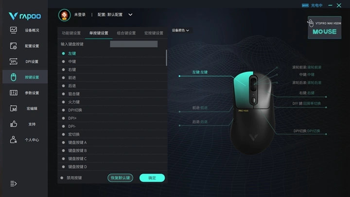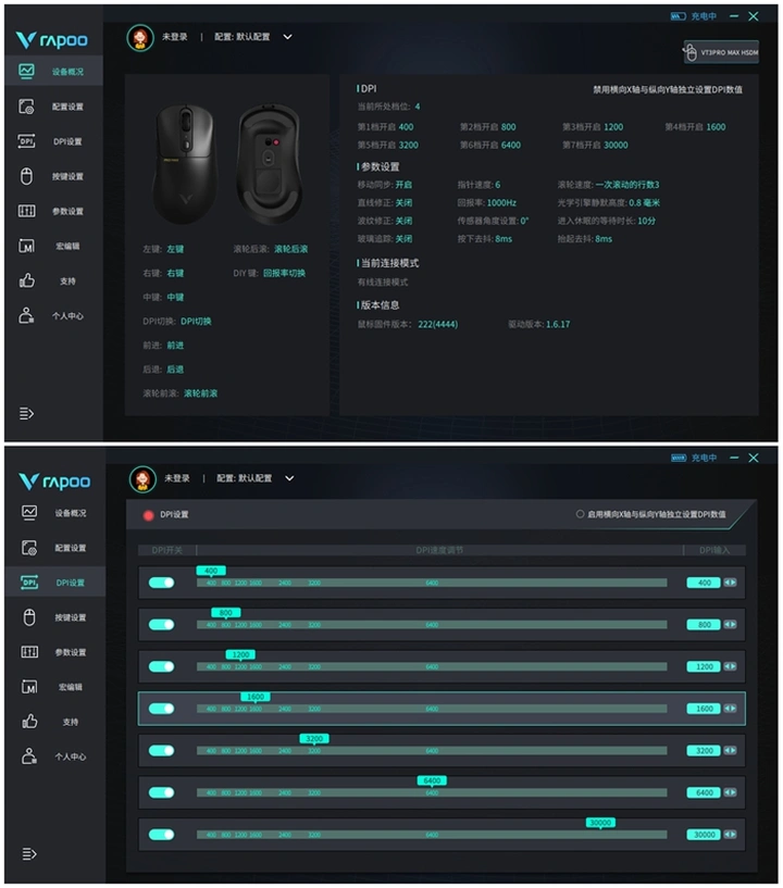 配合驱动,可以进一步提升雷柏VT3Pro Max的使用体验,在首页就可以查看到电量等基础信息和高阶功能是否开关,DPI设置除了支持自定义7个DPI档位调节以外,还可以将X/Y轴拆分配置,这对常规用户来说可能没啥用,但对FPS游戏玩家的帮助可就大了,我们可以根据自己的游戏习惯和角色定位进行微调以达到最佳的操作效果。