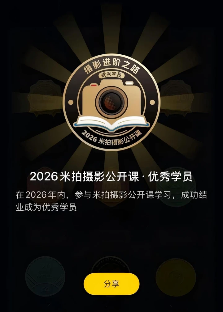 结课后的同学,可以获得米拍摄影社区“摄影进阶之路”学习徽章,完成在线课程观看可获得学习证书。