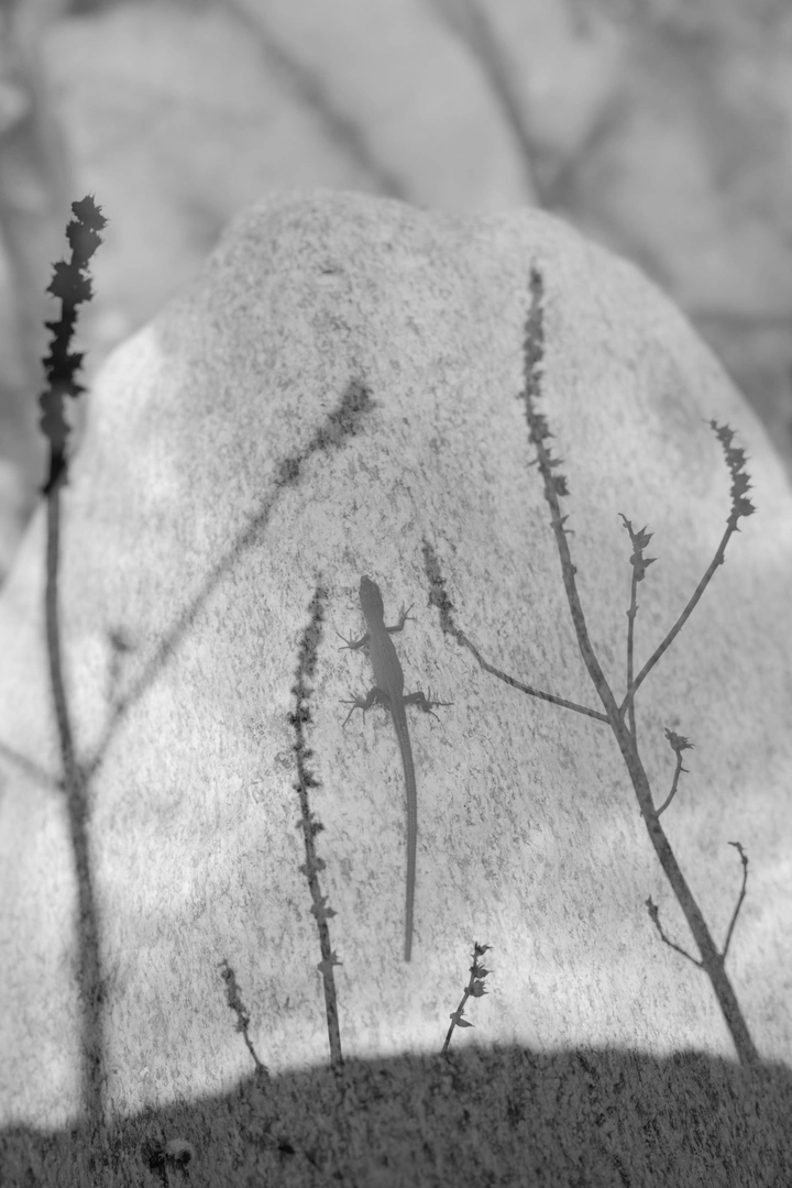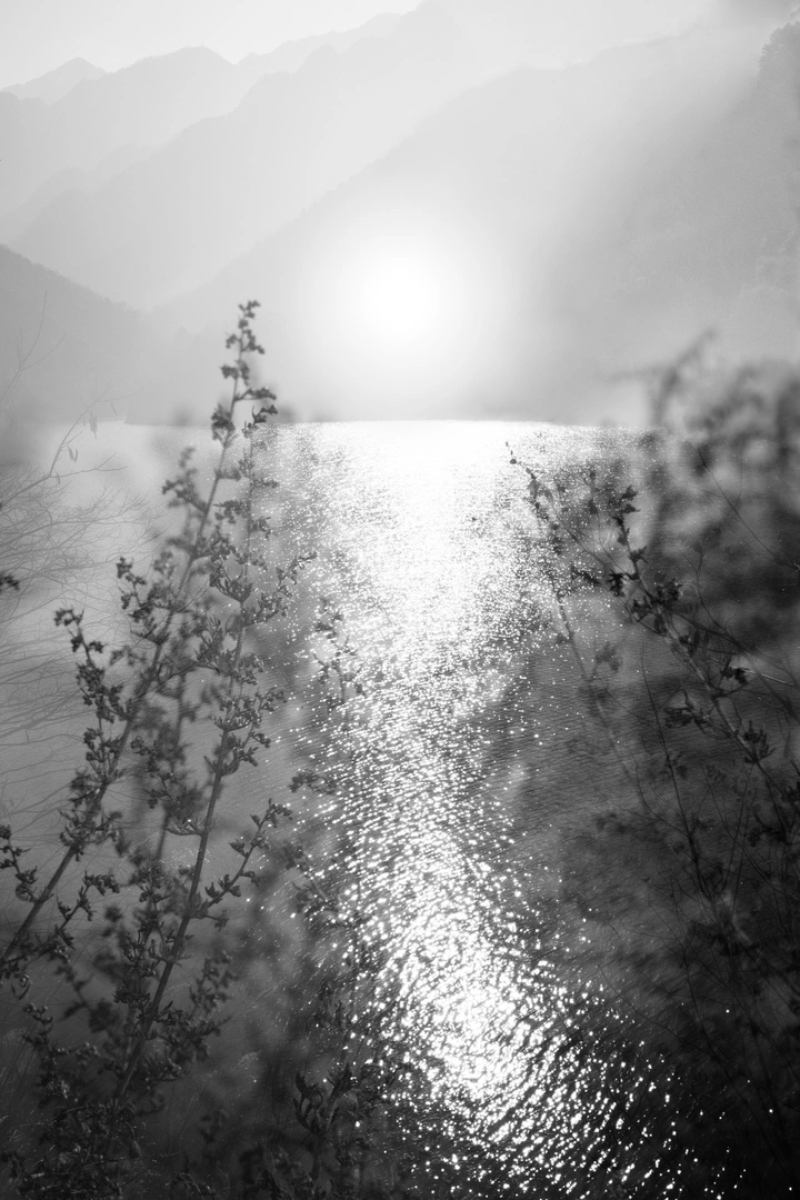 印象最深的是这幅《点石成金》,当时在秦岭大峪口,斜射的阳光照射在河滩的石头上,石头里的颗粒反射出金灿灿的阳光,再叠加好似物影摄影的植物,让我联想到也许古代有隐居在此的道士进行炼金实验。”