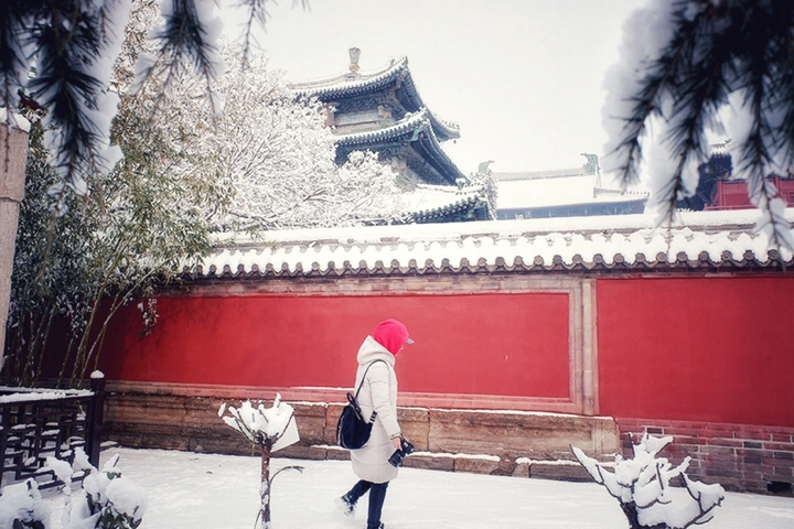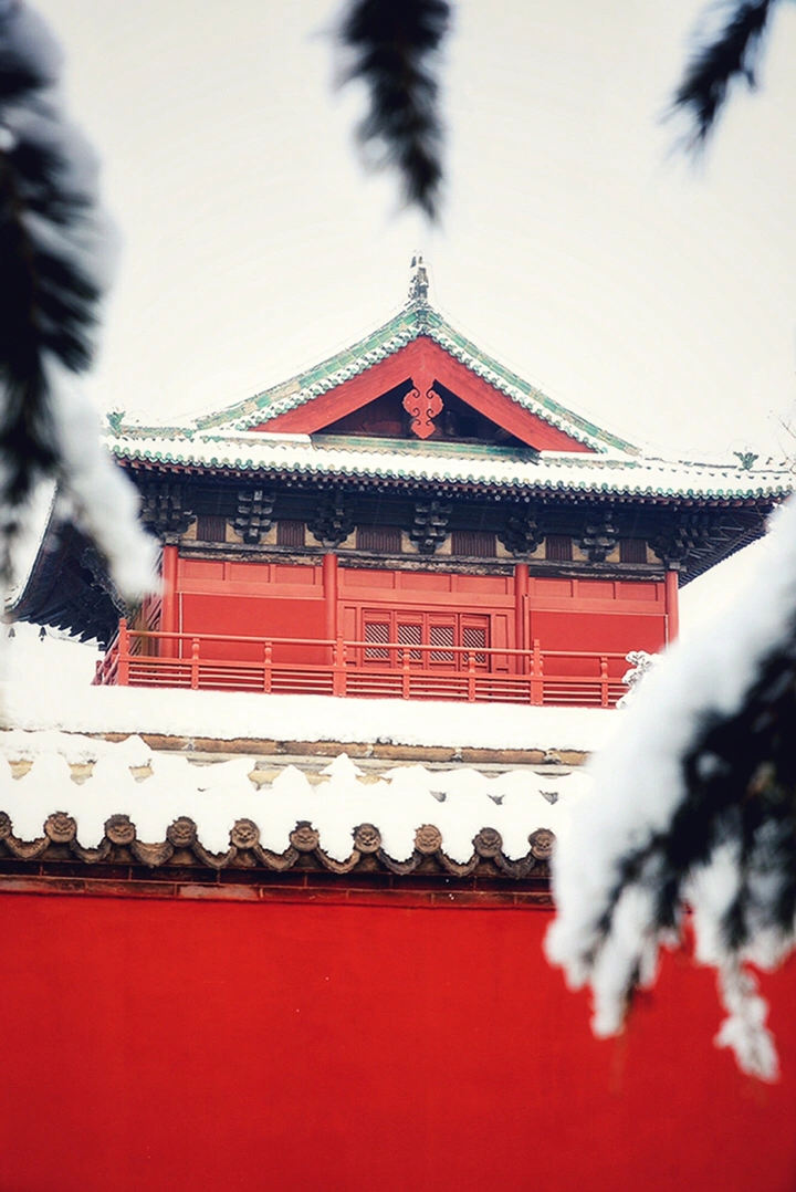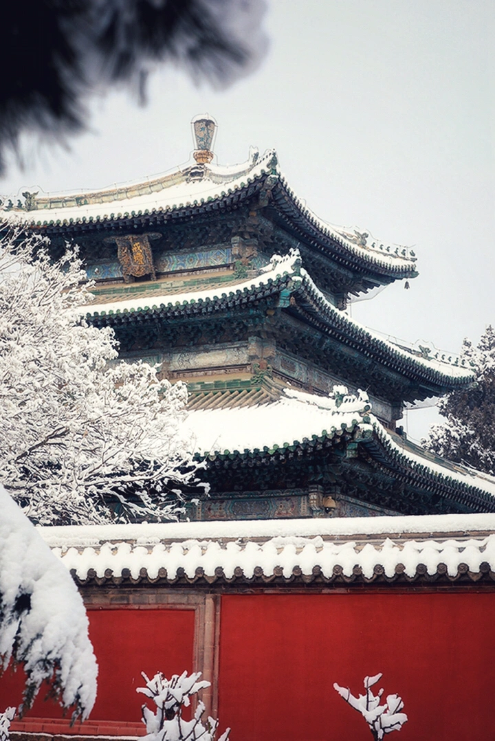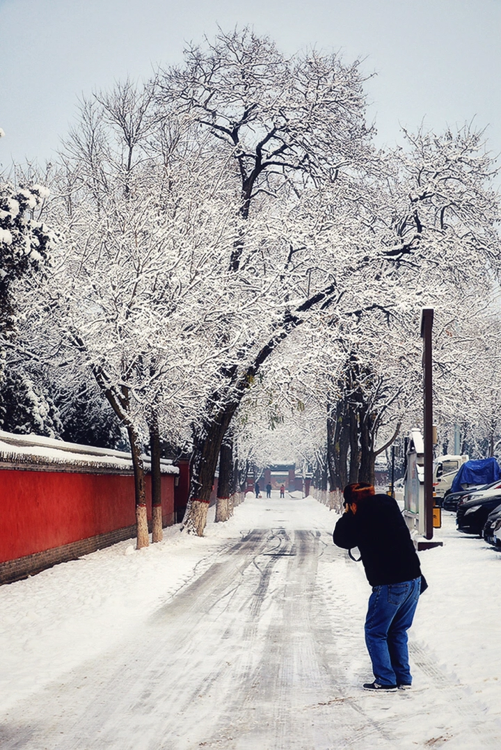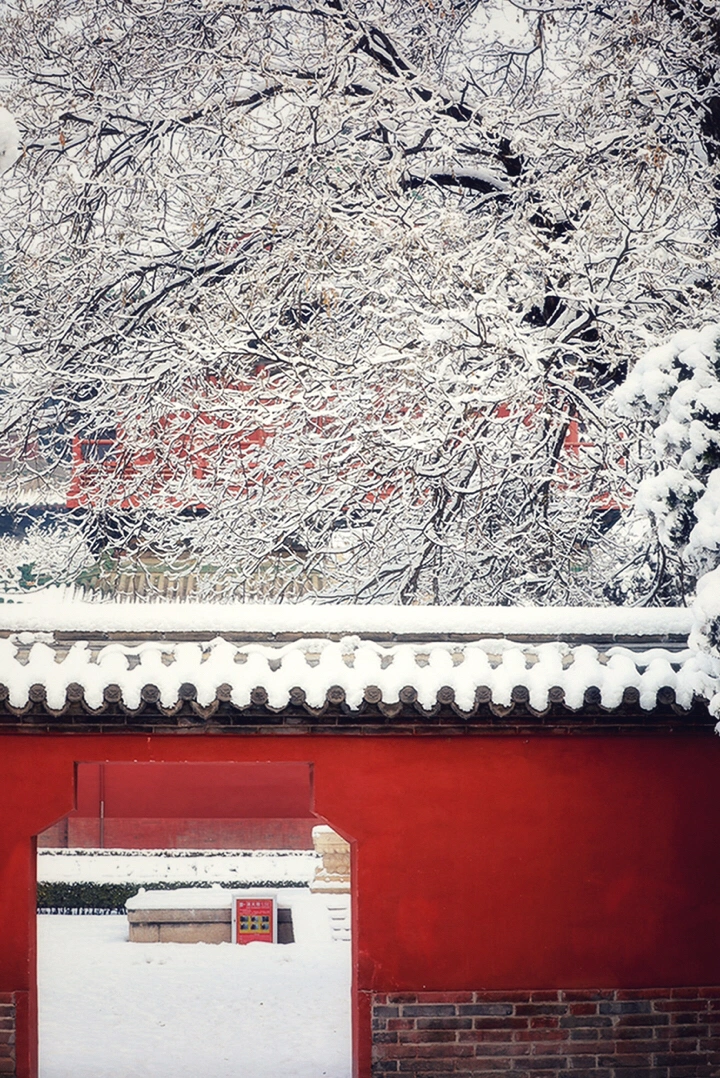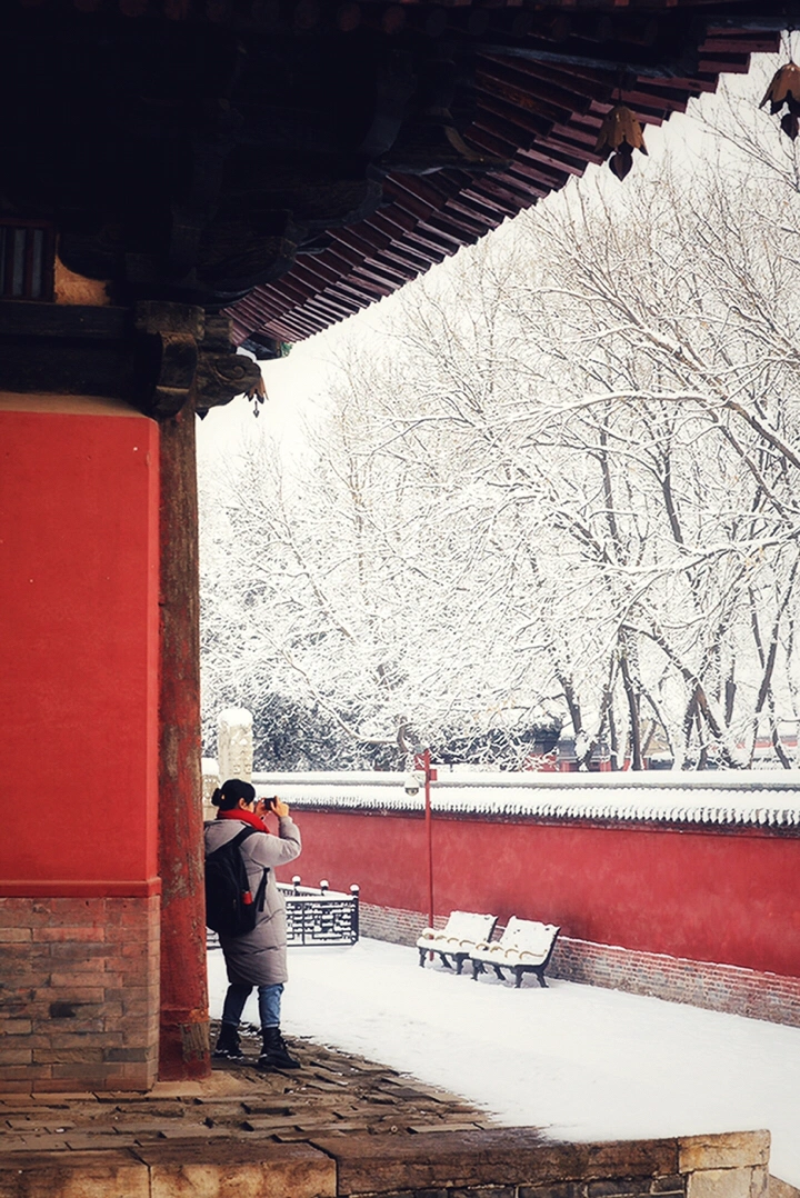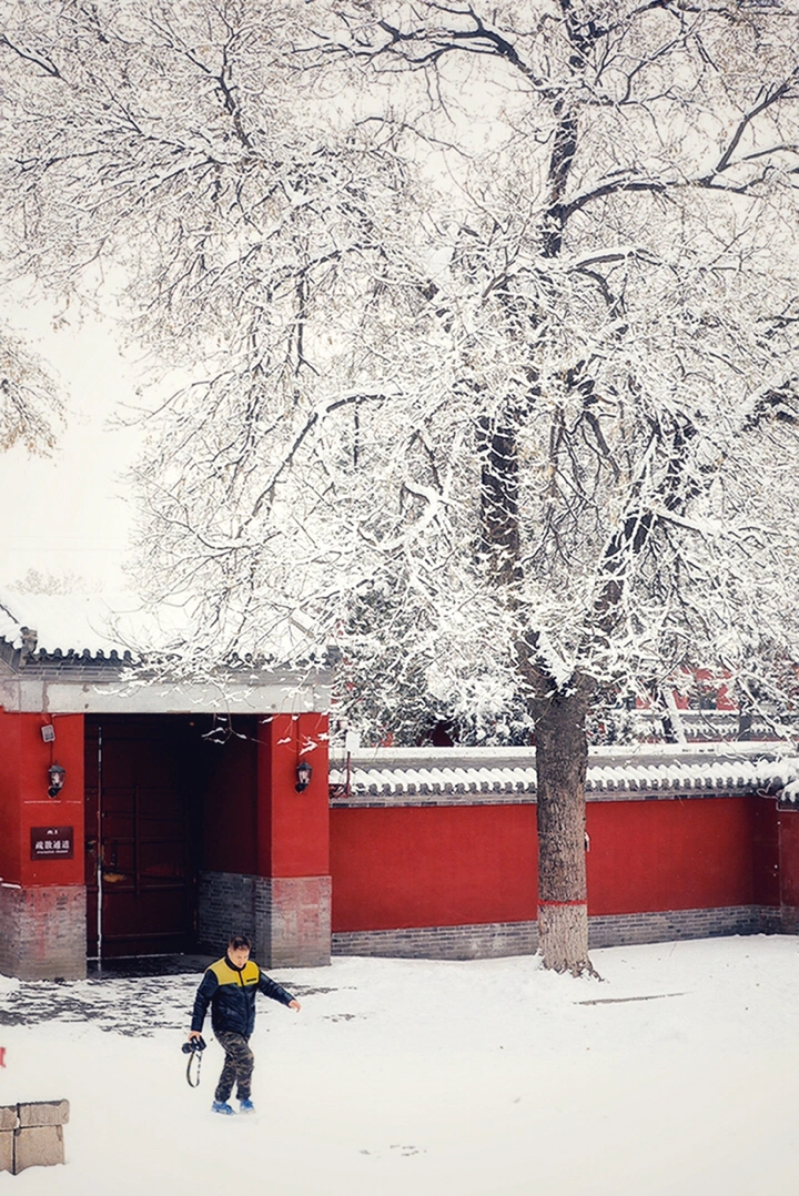 千年古刹大佛寺,每每下雪,就会成为影友必须打卡的地方。都说一下雪故宫就成了紫禁城。下雪的大佛寺,本身就是一首诗,漫漫飞雪,清新脱俗,冰清玉洁,银装素裹,白雪却嫌春色晚,故穿庭树作飞花。当红墙遇到白雪,惊艳了古城,温暖的时光。雪域临风,身心俱净。