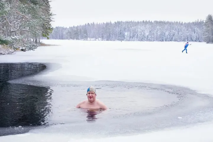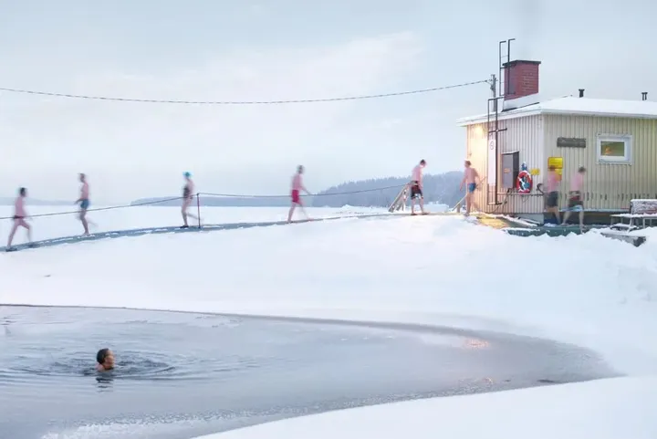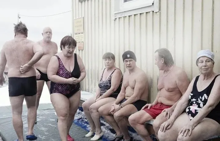 芬兰人燥起来, 战斗民族也要抖三抖。这里的男女老少,个个像开了挂一般纷纷穿起泳衣,在零下24度的天气里一头扎进结冰的湖里。