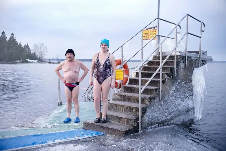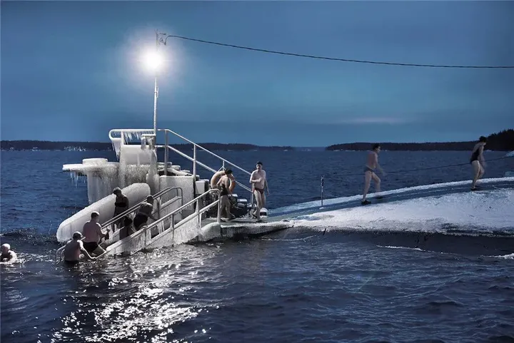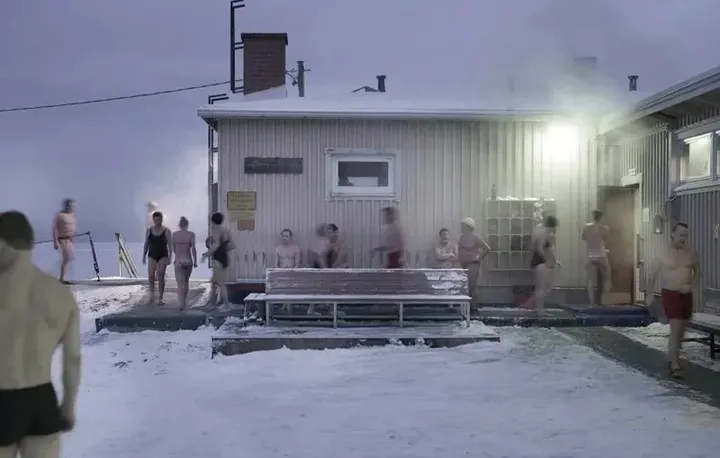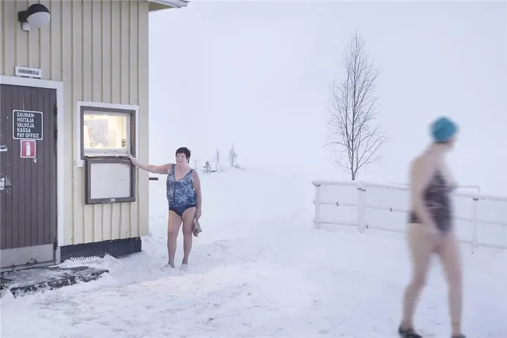 2015年1月,摄影师Markku回到了自己的家乡坦佩雷。因为并没有长期生活在自己的家乡,当他开着汽车路过Rauhaniemi湖畔的时候,看着这群光着膀子的人群,Markku惊呆了!