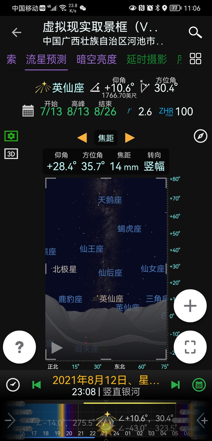 其二、因为红水河第一湾的拍摄方位是东北方向,在利用巧摄做计划可以看到英仙座流星雨的辐射点英仙座,在晚上22点30分从地平升起后,整晚都在红水河第一湾上方围绕着北极星转圈运动,这也意味着我们有机会在这个方向拍到更多来自辐射点的流星。