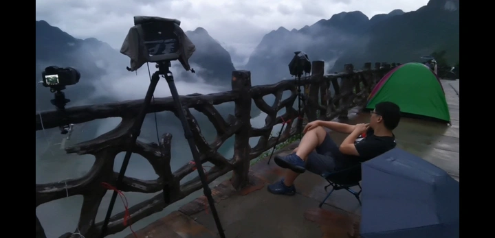 入夜后天空的情况其实并不是那么理想,天空中总是伴着一些薄云,拍出来的星空也是朦朦胧胧,一直到晚上10点左右,突然下了一场中雨,降水量不算很大,但是很突然,还伴随着闪电,我们只能中断拍摄把机子收起躲回车上,10分钟后雨水渐停,但仍然飘着一些雨水,我们只能继续打伞在各自机位上等待拍摄…
