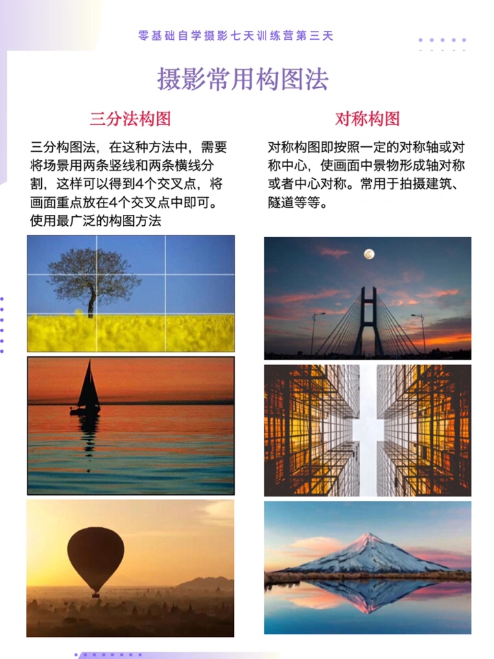 1⃣️三分法构图:适用范围最广泛的构图法,只要将拍摄主题放置在交叉点或者等分线上都会是一张不错的构图