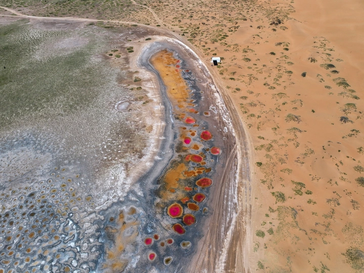乌兰湖(蒙古语:Улааннуур)是位于中国第四大沙漠腾格里沙漠的东部,地处内蒙古自治区阿拉善盟阿拉善左旗巴彦浩特镇,乌兰在蒙语中的意思即为“红色的”,在当地人口中也被称为“红海子”。 乌兰湖因其湖水颜色为红色,形状似心脏而得名。由于湖水里面含有杜氏盐藻和嗜盐菌等,这些微生物在高温下这些盐藻会释放一种菌胡萝卜素,使湖水变成红色。 乌兰湖的湖面形状如一颗跳动心脏,红色的湖水像血液一样流淌。故被称为“地球之心”和“红海子”—乌兰湖。“乌兰”在蒙语中是“红色的”意思。 乌兰湖的湖水之所以是红色,是因为湖水里面含有杜氏盐藻和嗜盐菌等微生物,这些盐藻会释放一种菌胡萝卜素,温度越高,释放的就会越多。杜氏盐藻是一种能在高盐度海水中生活的微藻,在高盐环境中变成红色。乌兰湖所处的环境由于气候干燥降水较少,很有利于盐湖的形成,也为盐湖内盐藻和微生物的繁殖提供了生存空间。盐湖中一圈圈像是血管脉络的白色部分,为盐碱成分。其所处的地势低洼封闭也有利于地表和地下水的汇聚,在沙漠环境中,使湖水不易完全干涸,就形成了我们如今看到的乌兰湖。 1995年乌兰湖曾完全干涸。