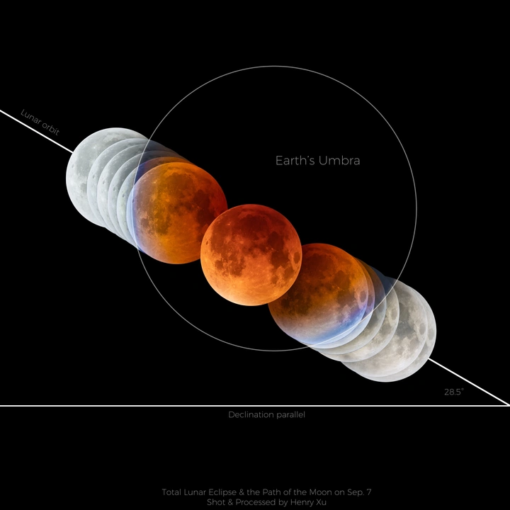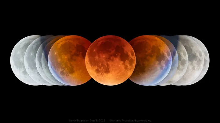 当你看到这张图的时候,你就知道月全食是怎么回事了! 9月8日00:27月亮缺了一角 01:30月亮完全进入地球影子 02:12月亮与地球、太阳连成一条线,抵达最暗的位置 02:53月亮开始脱离地球影子 03:56月亮完全离开地球影子 至此,本影月食完美结束。 (图中顺序从右往左) 拍摄器材:Celestron EdgeHD 9.25"、佳能R5 markii、AM5赤道仪、图谱G3M678M导星相机 拍摄技巧:间隔1分钟拍摄一组5张包围曝光,后期使用PS的camera raw进行HDR合并,地球本影直径为月球直径的2.7倍。
