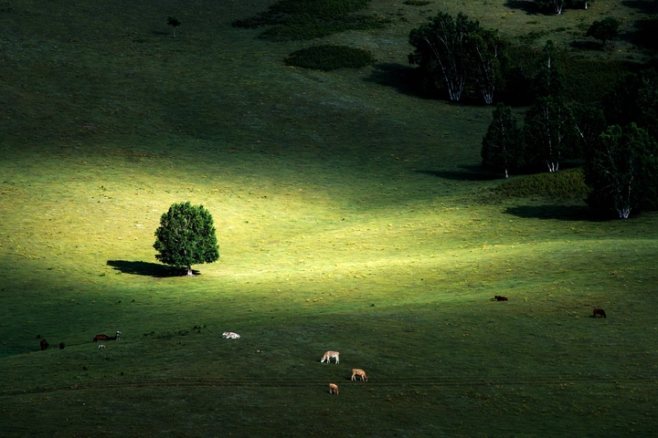 天开眼,一束阳光打在草原中那颗孤树之上,像极了舞台灯光。