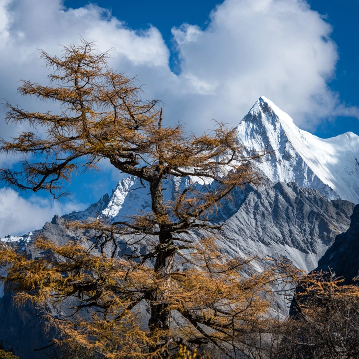 徒步亚丁神山,阳光透过雪松映照在神山之上,温暖且神圣。