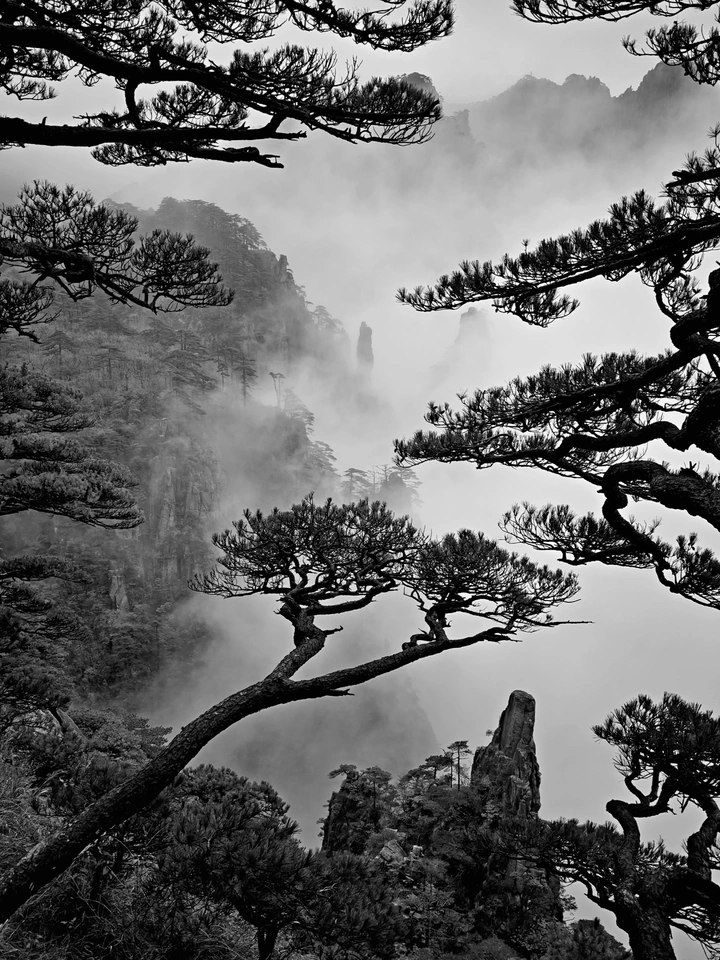 在黄山蹲守两天,甚至凌晨四点起床顶着冷风瞎熬🐷眼,一直大雾弥漫,直到中午十二点走到排云亭附近,看到这个机位,感觉有戏,于是坐下来等,半个小时后云雾突然裂开一道口子,后边的山峰隐约可见,掏出手机拍下了这张照片,十秒钟之后,一切消失不见。