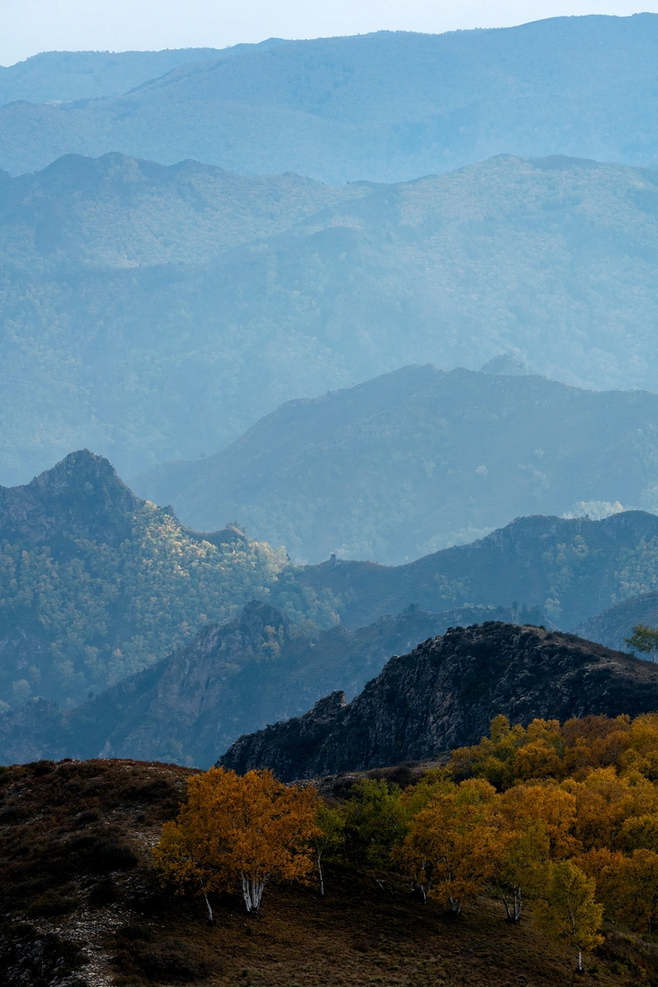 长焦的压缩下,海拔不高的阴山山脉层峦叠嶂,秋意盎然。