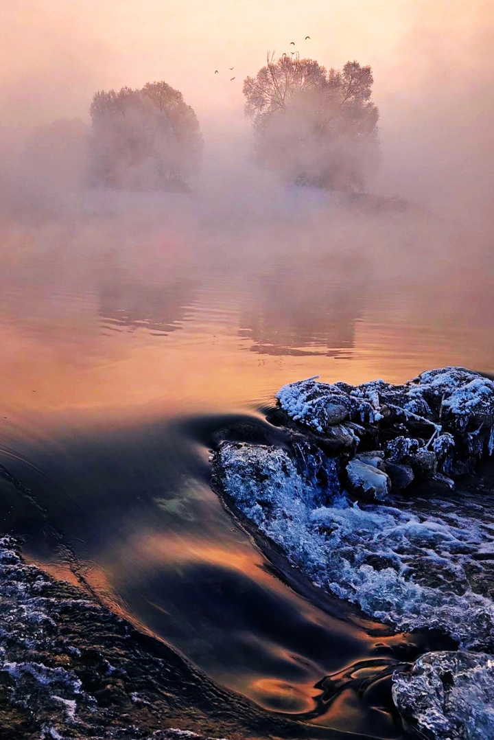 晨光映射下,河水如金属般的质感,远方的雾凇在雾中若隐若现。