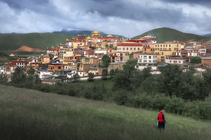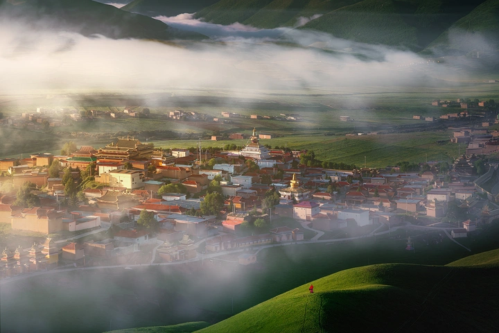 晨雾漫过绿野,梵境在朦胧中苏醒。屋舍错落,金顶隐现,炊烟与薄雾缠绵。草坡上一点红,在聆听这天地交融的静谧絮语 。