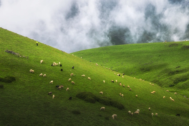 云雾轻柔地在山间弥漫,像是给大地蒙上了一层薄纱;鲜嫩的绿草铺展开来,宛如绵软的绿毡。洁白的羊群星星点点散落其间,远处牧人静静伫立,仿佛融入天边,在自然里寻得安暖 。