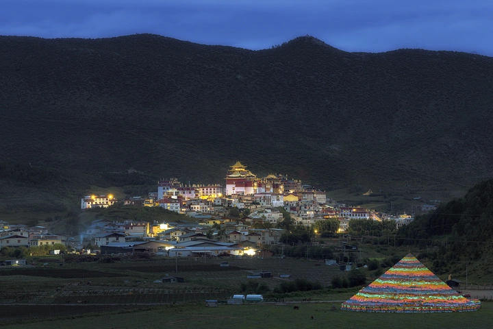 黎明时分,松赞林寺在微光里渐显轮廓。金顶、屋舍沾着晨露,彩色经幡塔如梦幻棱镜,天地初醒,信仰在晨光中静静鎏光。