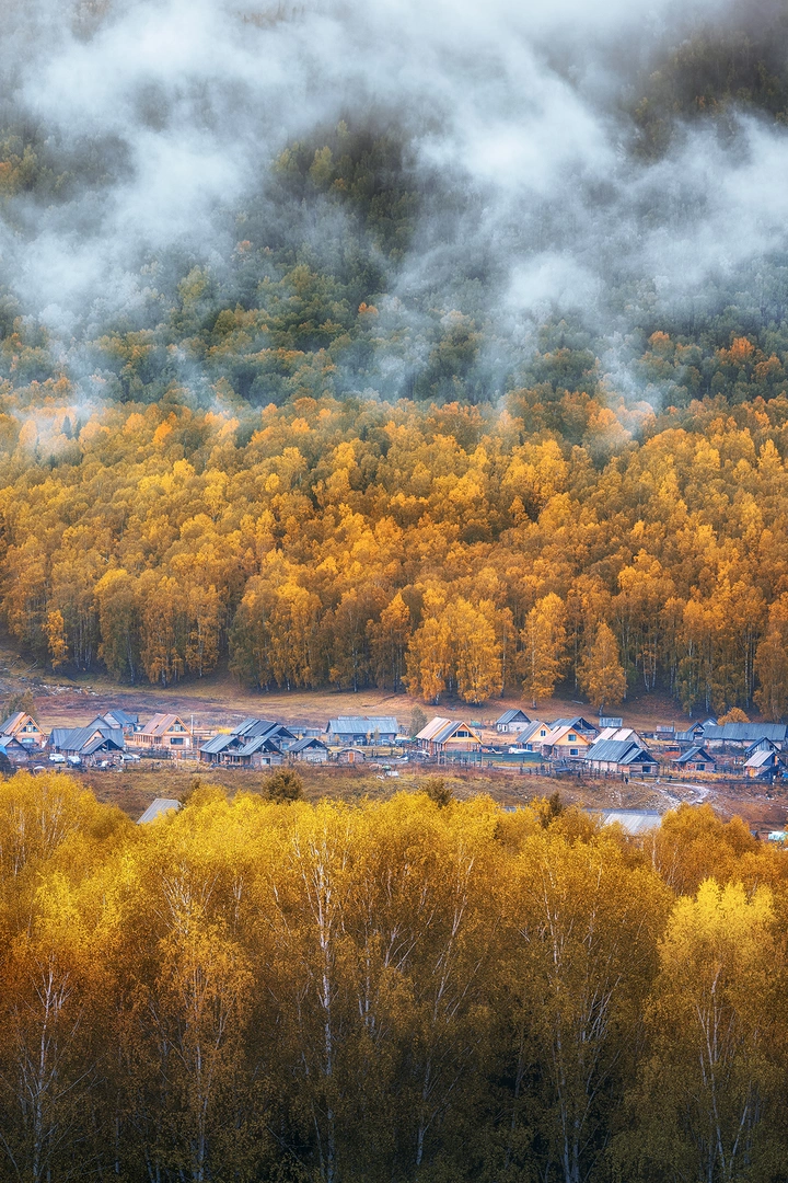 雾缠阿勒泰的山,白桦泼遍金浪,小村卧在秋林褶皱里。风裹叶香漫过屋舍,每缕烟都织着北疆的秋意。
