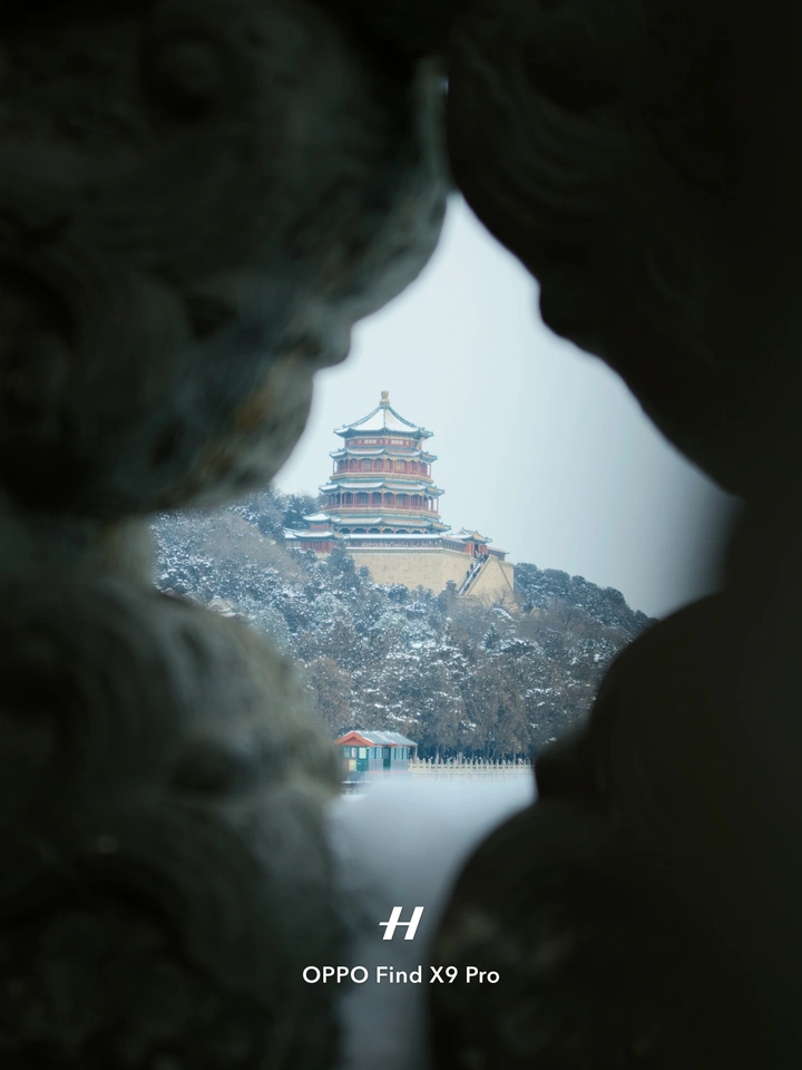 雪把天地晕成素白,枯树弯出一道温柔的弧,远处佛香阁在山影里,像从古画里走出来的景致。