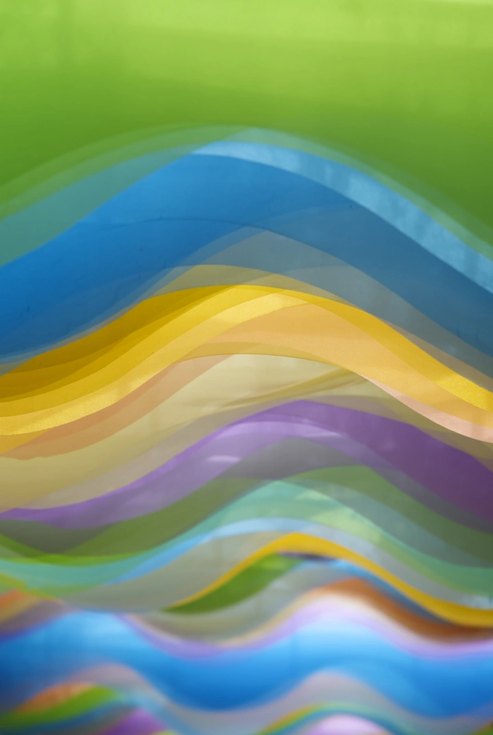 彩色的云幔在忽明忽暗的阳光下跳跃,风把她们的身姿变得更妩媚,仿佛一道流动的彩云。