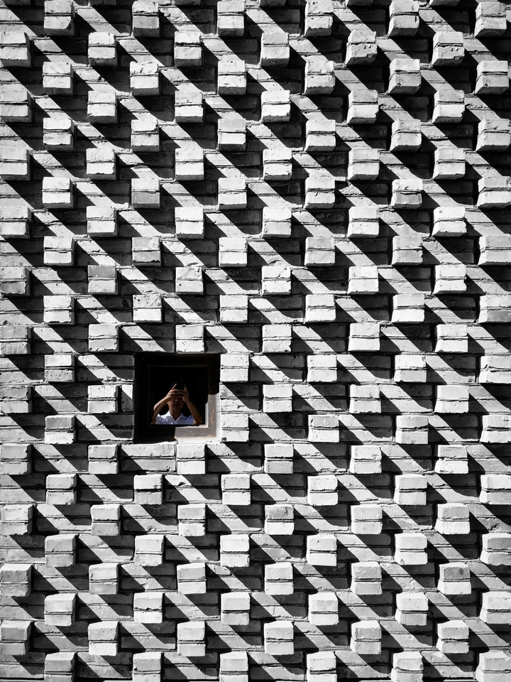 路过一面挺有特色的墙,阳光斜照,拉出排列整齐的光影。 我拍墙,发现小窗居然也在偷"拍"我。 摄于福州。