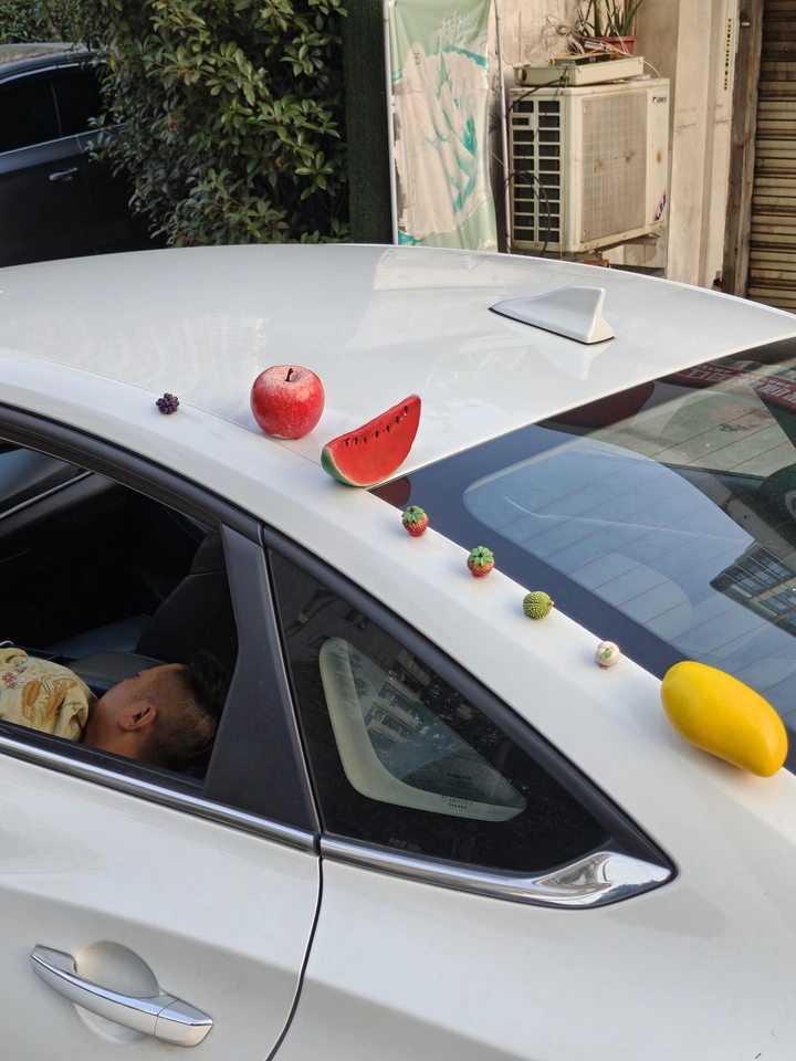 白色车身的线条间,错落摆放着苹果、西瓜、芒果等缤纷果实,车内的人物仿佛进入了甜美的梦乡。