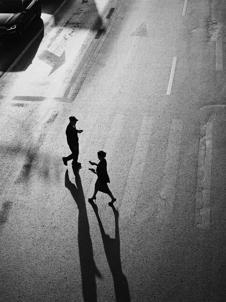 光与影在路面织成网, 他们是两枚游动的墨点, 各自拖着 细长的尾。 一个低头, 指尖亮着小小的光; 一个迈步, 鞋跟叩响沉默的巷。 在这黑白的琴键上, 脚步是音符, 影子是回声, 合奏着 城市里 无人打扰的 独幕剧。
