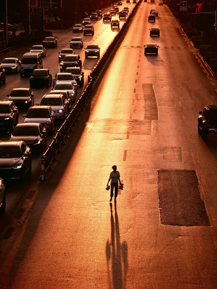 车流像凝固的金属河,把路劈成两半。一半是喧嚣的、被规则捆住的匆忙,一半是被夕阳焐热的、只有影子作伴的空旷。人走在中间,倒像个被时间遗落的逗号——两边的世界都在往前涌,他却借着光的坡度,把脚步放得比影子还慢。