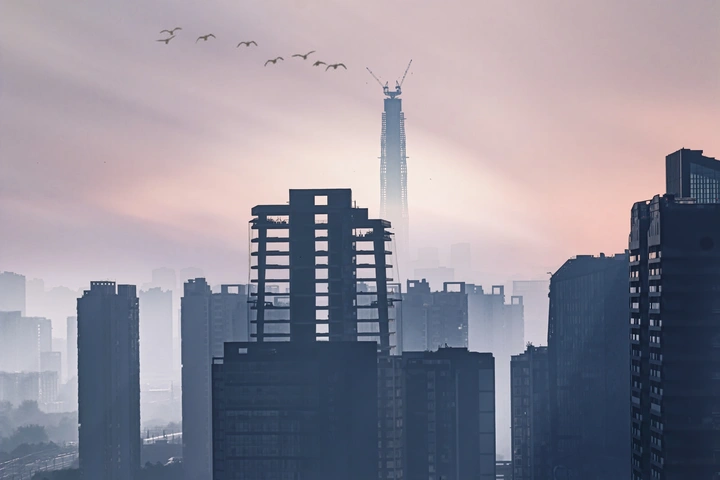 构图:虚实交织的空间叙事,画面以“低饱和剪影+朦胧远景”构建层次分明的视觉结构。前景中,几栋未完工的建筑以几何线条切割画面,框架式结构形成稳定的视觉锚点;中景处,高耸的在建摩天楼如银色利剑刺破晨雾,塔吊的金属骨架在逆光中勾勒出工业美学的冷峻轮廓;远景的淡紫色雾霭里,飞鸟群以不规则弧线掠过天际,与垂直的建筑形成动静对比。这种“近实远虚”的构图,既强化了空间纵深感,又通过飞鸟、建筑、晨雾的三重对话,暗喻城市发展中自然与工业的共生关系。 色彩:极简色调中的情绪张力,全片以灰紫、淡粉、墨黑为基调,摒弃浓烈色彩,却在克制中传递丰富情绪。晨曦的柔光为雾霭镀上一层朦胧的粉紫色,如同城市初醒时的呼吸,温柔而神秘;建筑剪影以深灰与黑色为主,冷峻的工业质感与背景的柔和色调形成微妙平衡。这种“冷硬架构+暖调氛围”的配色,既凸显了现代都市的理性秩序,又赋予画面诗意的温度,仿佛冰冷的钢筋水泥也因晨光而有了生命的呼吸。 情感:静谧中的希望与哲思,画面传递出一种“静水流深”的情感张力:晨雾的朦胧自带疏离感,却因飞鸟的灵动而打破沉寂,暗示城市在静谧中孕育生机;未完工的高楼既是“未完成”的隐喻,也象征着持续生长的希望。