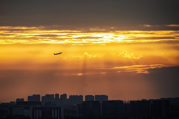 构图:黄金分割下的动态平衡,画面以“三层递进式”构图构建视觉秩序:底层城市剪影以水平线条铺陈,形成稳定的视觉基底;中层云海被霞光切割成横向光带,如大地向天空铺展的金色绸缎;顶层飞机以极小的黑色剪影悬于中央偏左位置,其飞行轨迹与云层的水平纹理形成45°角动态对抗。这种“稳定基底+流动中景+灵动点睛”的结构,既通过黄金分割律强化了画面平衡感,又以飞机的微小体量激活了宏大场景的叙事张力,仿佛天地间正在上演一场“自然盛景与人类文明的对话”。 色彩:烈焰与墨色的交响诗,作品以高饱和金色为主导,霞光从云层间隙倾泻而下,形成从柠檬黄到琥珀金的渐变层次,宛如熔化的金属液在天空流淌;云层边缘被镀上炽白高光,与暗部的深灰形成强烈明暗对比,凸显云海的厚重质感;城市剪影以纯黑统摄,与金色天光构成“墨色剪影+鎏金背景”的经典配色,既强化了空间纵深感,又让自然的壮丽与城市的静默形成情绪张力。色彩的极致碰撞中,落日的热烈与夜幕的沉静达成奇妙和解,传递出“白昼终章,华灯初上”的时间韵律。 情感:渺小与宏大的共振共鸣,画面最动人的情感内核,在于“微小个体”与“宏大宇宙的诗意对话。飞机作为人类文明的符号,在无垠霞光中渺小