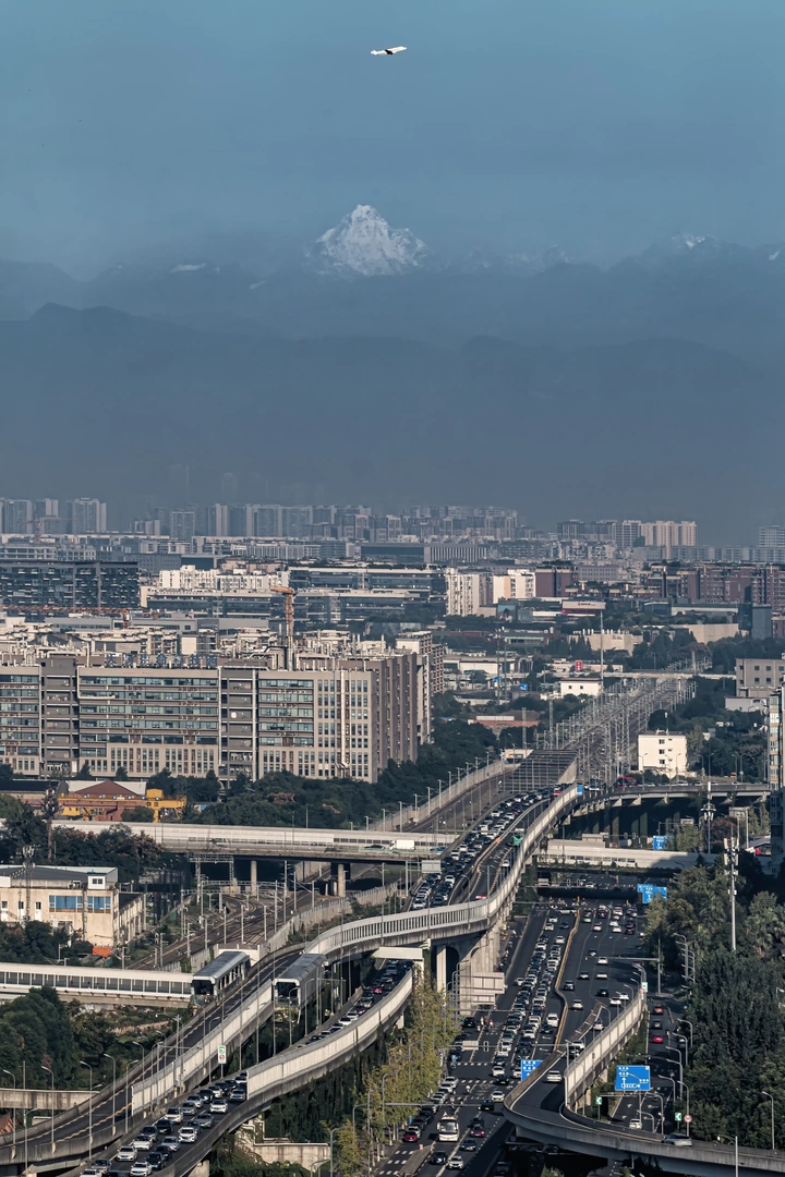 构图:层叠透视的时空叙事,画面以“三重天际线”构建纵向空间秩序:前景是立体交织的城市交通网络,纵横的高架桥如金属血脉流淌着都市律动;中景是鳞次栉比的建筑群,灰调楼群形成水平向的视觉基底;远景则是云雾中若隐若现的雪山,幺妹峰的皑皑峰顶如圣洁的惊叹号刺破天际。这种“近实远虚”的构图通过空气透视强化纵深感,飞机的微小剪影悬于天空,成为连接城市与雪山的视觉纽带,在宏大场景中注入灵动细节。 色彩:冷峻与生机的平衡术,作品以低饱和色调构建克制美学:城市建筑的灰白、水泥路面的青灰、远山的黛蓝共同构成冷静的工业底色;而穿插其间的绿树、橙色屋顶成为点睛的暖色,打破灰色调的沉闷;雪山峰顶的纯白在朦胧雾霭中更显圣洁,与下方繁忙的城市形成“静与动”“冷与暖”的色彩对话。色彩的精妙在于“藏”与“露”的平衡——大面积的灰调中,雪山的白、植被的绿、车流的金属反光被精准捕捉,赋予画面呼吸感。 情感:日常与远方的双重慰藉,画面传递出独特的情感张力:近处车水马龙的喧嚣是人间烟火的真实,远处雪山的静默矗立则是精神的诗与远方。观者既能在纵横交错的路网中感受到城市的脉搏与活力,也能从雪山的永恒中获得心灵的沉静。身在市井心怀丘壑