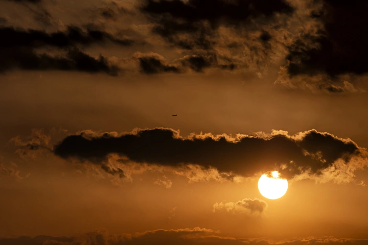 构图:极简中的宏大叙事,画面以黄金分割构建秩序:落日居右下角黄金点位,炽白光芒与熔金云层形成视觉焦点;横向暗云如大地剪影横贯中部,分割出上下层次的天空,上方墨云翻滚,下方暖橙渐染;微小飞机悬于云层与落日间,成为连接天地的“视觉锚点”。极简元素——圆(落日)、线(云层边缘)、点(飞机)——构建宇宙级宏大感,留白处赋予无限想象。 色彩:单色调里的层次美学,以橙褐色系统领全局,单色中演绎丰富层次:落日核心纯白过渡为熔金、暖橙、赭石,直至暗云的深褐近黑。云层受光面泛金边,背光面沉如墨染,光影流动赋予画面呼吸感。“单色不单调”的处理强化暮色氛围,明度对比凸显主体,让落日辉煌与云层厚重形成戏剧性张力。 情感与主题:孤独与永恒的对话,暖光与暗云交织,传递“归家慰藉”与“白昼终结”的矛盾情感;飞机孤影既是远方信使,又承载旅人的乡愁,触动“归途”与“远方”的深层思考。主题直击“永恒与短暂”:落日代表亘古天体运行,飞机象征人类文明轨迹,暗云流动喻世事无常,在浩瀚时空中追问生命意义。 艺术价值:瞬间即永恒的定格,捕捉暮色“黄金时刻”,将光影、云层、飞机融为一体,成就“瞬间即永恒”的艺术。以简驭繁的创作兼精彩