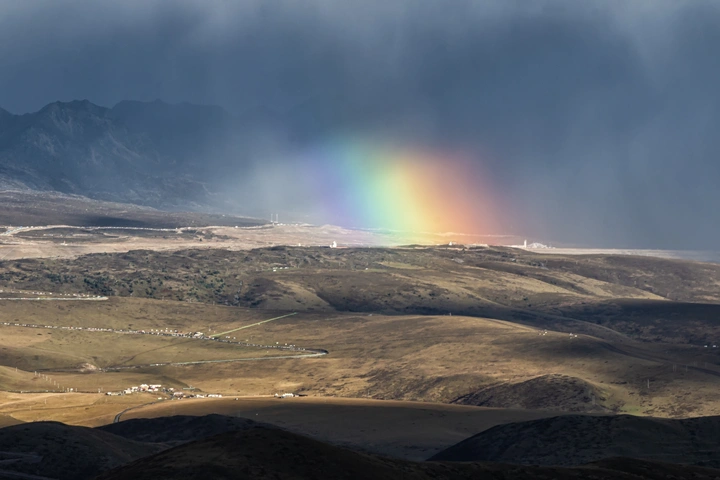 构图:天地间的彩虹拱门 远景山峦如黛,中景草原起伏,近景沟壑纵横,形成“山-原-谷”的立体层次。彩虹横跨画面中上部,弧形光带与地平线平行,将阴沉天幕与土黄大地分割,又以七彩光芒缝合天地,构成“压迫-突破”的视觉张力。 色彩:灰度世界的光韵突围 深灰云层与墨蓝远山构建压抑基调,土黄草原的暖调成为过渡,彩虹的赤橙黄绿青蓝紫则如突围的光瀑,在阴霾中撕开绚烂裂口。色彩对比强烈却和谐,暗调背景让七彩光芒更显神圣,似天地间的调色盘被突然打翻。 情感与主题:困境中的希望礼赞 乌云的厚重与彩虹的轻盈形成情绪对冲,传递“风雨过后见彩虹”的治愈力量。主题直指“逆境与重生”:草原的苍茫象征生活的磨砺,彩虹则是困境后的馈赠,让观者在压抑中捕捉到生命的亮色与韧性。 艺术价值:瞬间史诗的纪实美学 摄影师定格彩虹最饱满的“黄金时刻”,将自然奇观与人文情感融合。雨雾的朦胧质感增添诗意,草原小径的车辙印暗示人类痕迹,让作品超越风景本身,成为对“自然伟力与生命希望”的视觉颂歌。