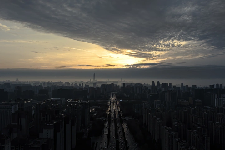 这幅作品采用“中心透视构图”,纵向延伸的城市主干道如脉络般贯穿画面,将视线引向远方的摩天楼,两侧建筑群形成对称的纵向框架,强化了城市的纵深感。前景车流的点状灯光与背景朦胧的城市轮廓形成虚实对比,云层的横向纹理与道路的纵向线条构成平衡。 色彩上以冷灰为主调,天空的暗灰、建筑的深黑与地平线处的暖黄霞光形成冷暖对冲,霞光的柔和光晕为冷峻的城市增添了温度。光影处理细腻,云层的明暗层次与建筑的剪影质感,让画面在压抑中透着希望。 情感层面传递出都市的疏离与生机,冷峻色调下的车流如流动的星火,展现着城市的不眠活力,也让人感受到个体在钢铁森林中的渺小。主题上通过“天空-城市-道路”的三重意象,探讨了现代都市的冰冷与温暖、压抑与希望。 艺术价值在于将日常城市景观升华为诗意表达,摄影师以高空视角捕捉城市韵律,用冷暖对比的色调传递复杂情绪,让观者在熟悉的城市图景中,重新审视现代生活的质感,是兼具视觉冲击力与情感共鸣的佳作。 “车河”描绘主干道上车流如河的动态,“向晓”则指向黎明破晓的时刻,以流动的车流呼应城市苏醒的节奏,充满生活的真实感。