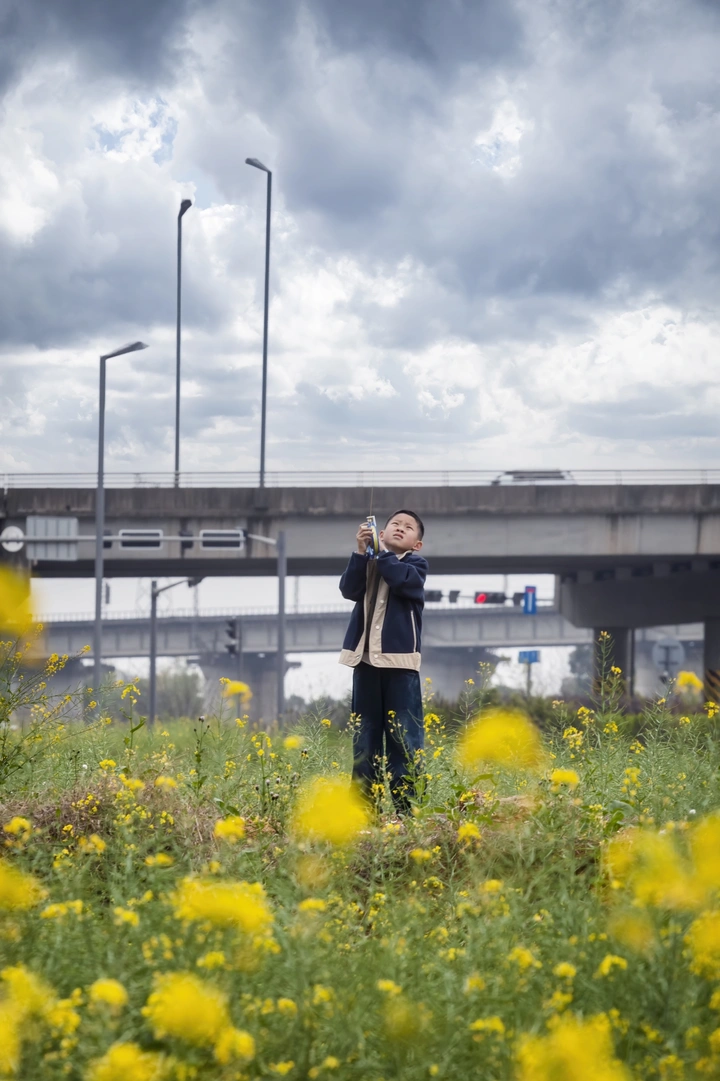 哇,你站在油菜花里放风筝的样子超酷!手里的线轴好像握着一整个春天,连天上的云都放慢脚步想看看你的风筝,这张照片把你最开心的瞬间都留住啦! 这幅作品采用“中心构图”,男孩居于画面视觉核心,前景的黄色花田形成天然框架,将视线引向男孩,背景的高架桥与路灯则构建出城市边缘的层次感,男孩仰望的姿态与手中的线轴形成动态引导,让画面在静态中暗含张力。 色彩上以灰蓝天空的冷调为基底,前景暖黄的花田与男孩深色外套形成对比,既凸显了春日的生机,又保留了阴天的沉静。光影柔和,男孩面部的明暗层次捕捉到专注的神情,花田的朦胧虚化则增添了氛围感。 情感层面传递出纯粹的童真与向往,男孩仰望的姿态充满对远方的好奇,花田与高架桥的结合,既有自然的温柔,又有城市的疏离,让人在画面中感受到成长的纯粹与复杂。主题上通过“自然-城市-孩子”的元素,探讨了童真与成长、自然与城市的关系。 艺术价值在于捕捉到城市边缘的诗意瞬间,将日常的放风筝场景升华为对童真的致敬。它以小见大,在平凡的生活片段中,传递出对成长的思考与对纯粹的守护,为观者带来情感共鸣。