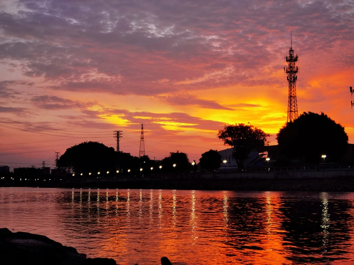 黄昏时刻,远处的天空展现出一片橙黄色的色彩,在水面的趁托下,这个城市就象一幅天然的油画般姜丽。