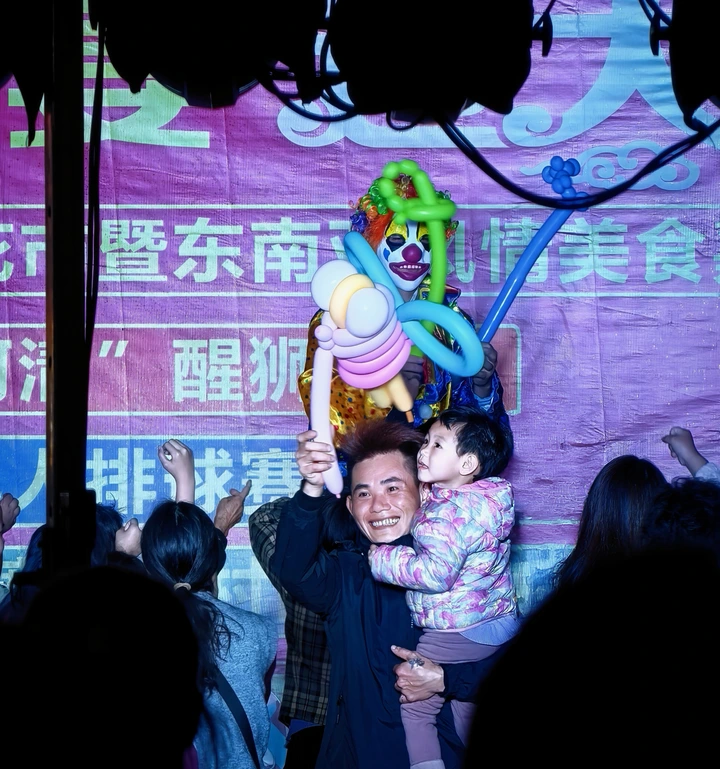 与台上的小丑进行互动游戏,父亲为孩子赢得了一份魔术气球奖品,他俩脸上都洋溢着欢快的笑容,那是发自内心的愉悦之情。