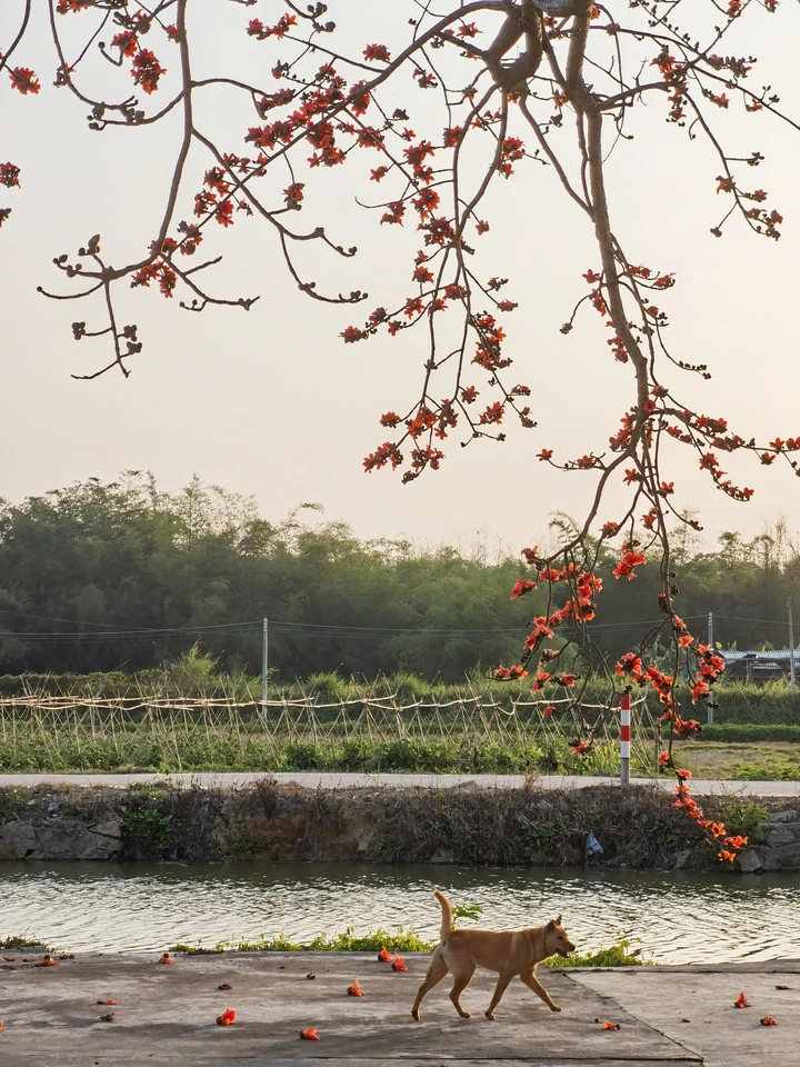 木棉花开满枝桠,落花铺成暖红,小黄狗踏过春水边的黄昏,把乡野的温柔都装进了这帧慢时光里。